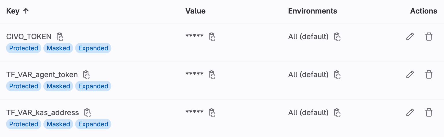 TF_VAR_cluster_description: Set a description for the cluster. To create a reference to your GitLab project on your Civo cluster detail page, set this value to$CI_PROJECT_URL. This value helps you determine which project was responsible for provisioning the cluster you see on the Civo dashboard. -